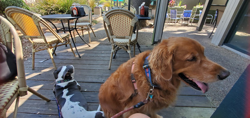 Henry has been dining out for years and shows Bell how to do it with ease. Bell has been out several times now and now understands how it works. It has been wonderful to take our doggie with us to dine out.