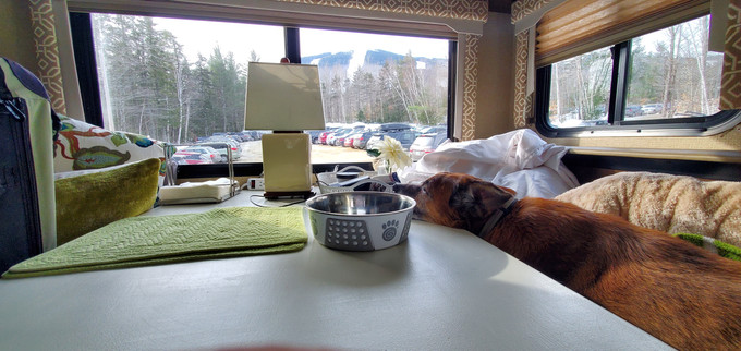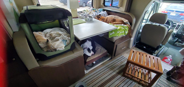 Since our dogs are old and slow, we left them in the mobile condo; which is now called "box of dogs" because Remy, the Golden, watched our dogs walking about outside his window then return to "the box".